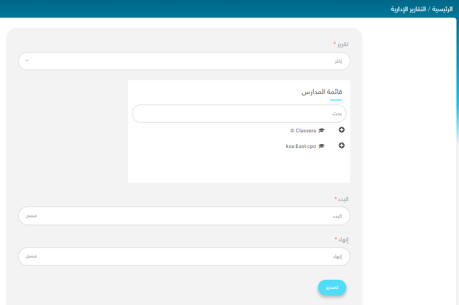 تُستخدم صفحة "التقارير الإدارية" لإنشاء تقارير إدارية مفصلة عن المدرسة والمعلمين والطلاب.