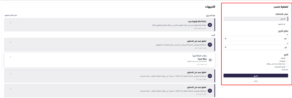 - نوع الإشعار: تبحث عن شيء محدد؟ ضع علامة على المربعات الخاصة بـ الرسائل، الشهادات، التعليقات، أو مواد المقرر لرؤية هذه التحديثات فقط.