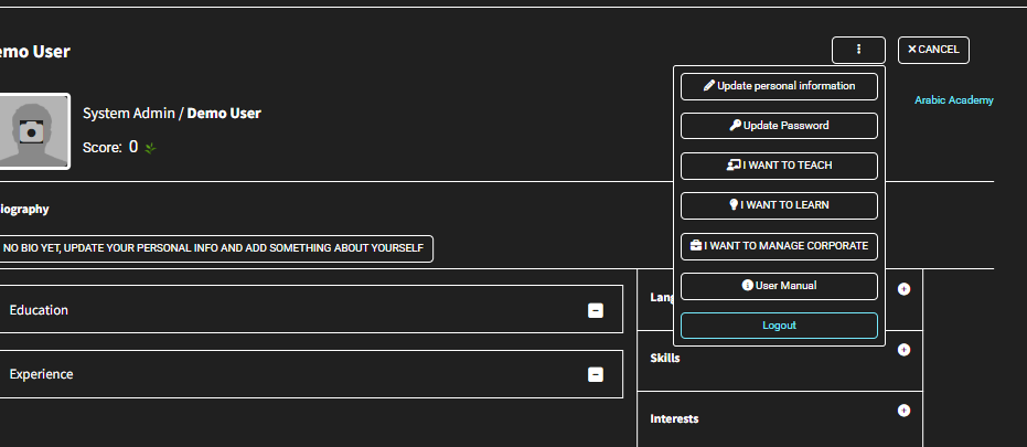 This is the main page on which you can edit your personal profile information.